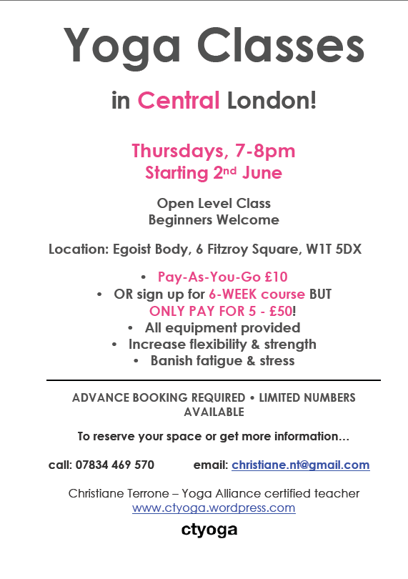 I very glad to announce that from this Thursday 2nd June i will be teaching weekly at Egoist Body (6 Fitzroy Square, W1T 5DX) from 7pm πŸ™‚
