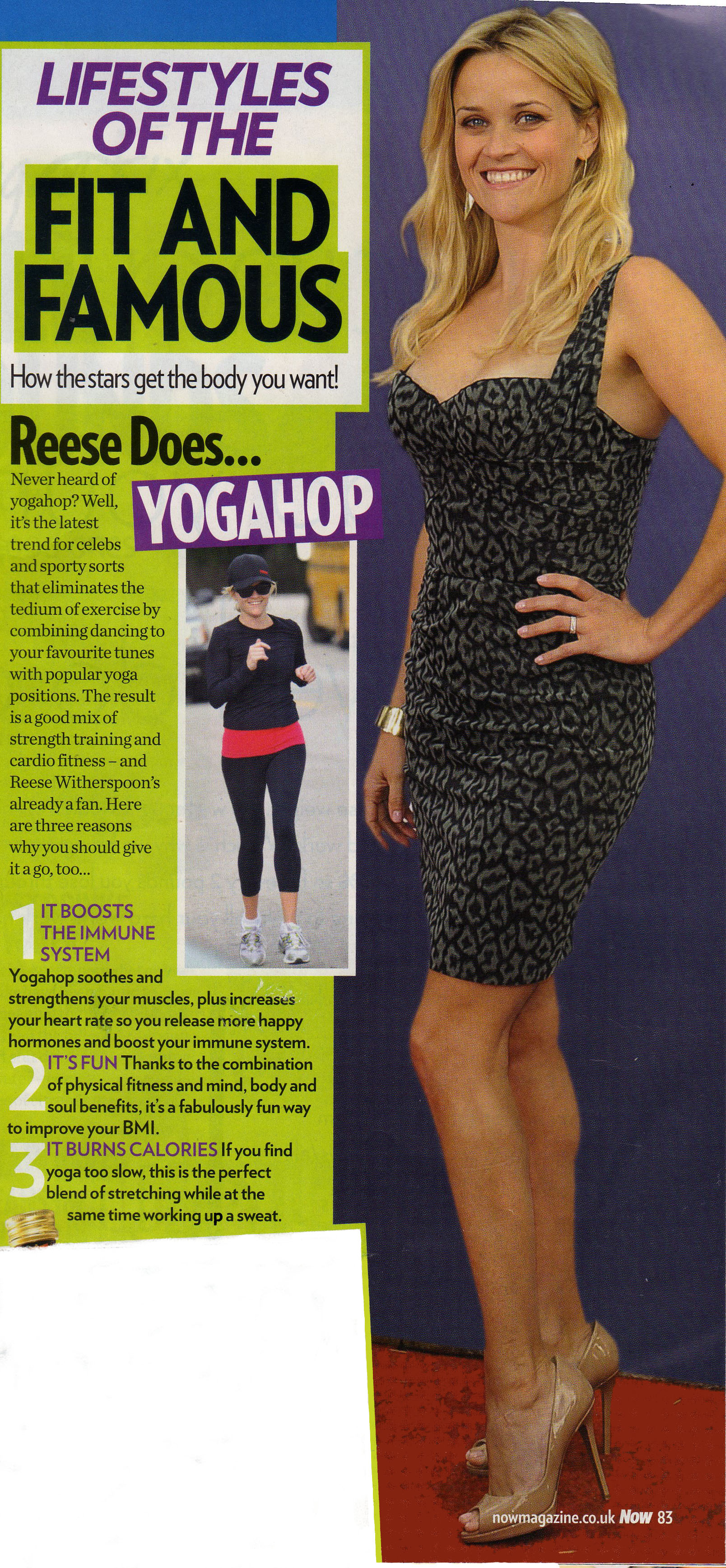 I saw this little article in NOW Magazine (no i did not buy it, i was given it!) about a new type of yoga: YogaHop! and apparently Reese Witherspoon is doing it! Dancing to yoga postures? i can’t quite picture it, can you?