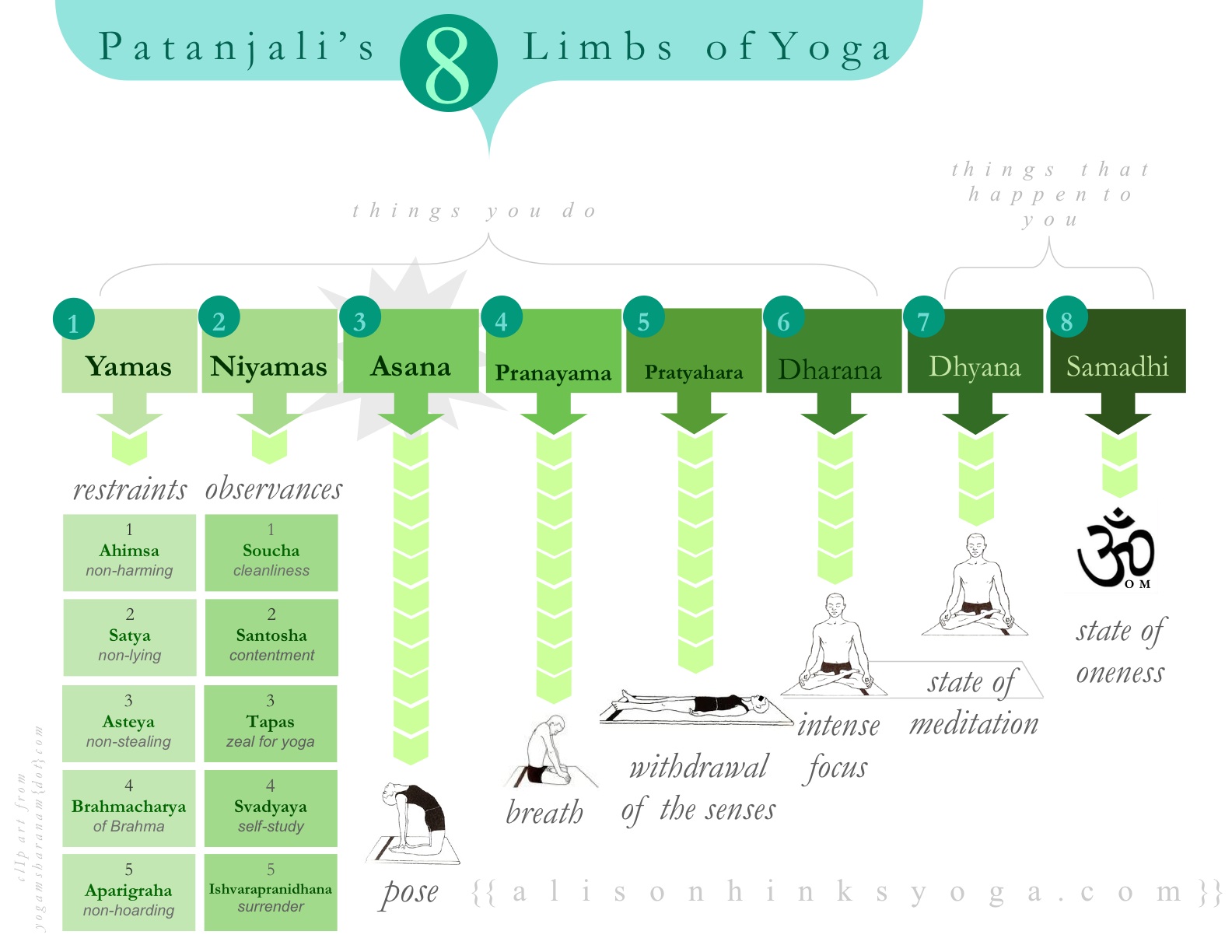 Approximately two thousand years ago, a sage by the name of Patanjali composed the Yoga Sutras, a collection of 196 aphorisms on yoga. It is one of the most influential and classical treatises on yoga philosophy and practice. In Chapter 2 of the Yoga Sutras, Patanjali prescribes adherence to an eight-fold path of yoga, otherwise known as “Ashtanga Yoga” (not to be confused with the Ashtanga style of yoga practice taught by Sri K. Pattabhi Jois, see ashtanga vinyasa yoga).